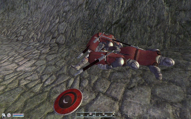 With that out of the way my next act was to go to the cave just outside of town and kill all of the vampires inside. So Val and I began our trek out the city doors and down the road toward the cave when we came upon this odd sight...