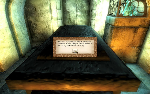 I found Hannibal Traven, who had sacraficed himself in that dark crystal so that I might smite volde..err..Mannimarco. I spent a couple of minutes paying tribute with a little bit of silence and remembering what he'd done. Standing by his tomb had a solemn air, yet peaceful.